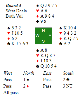 Ved det andre bordet spilte vest 3NT. Nord spilte ut stor hjerter. Nå er det to bet om nord skifter til ruter. Syd vinner med esset, og hjerter gjennom gjør at forsvaret får fem hjerterstikk pluss ruter ess. Nord fant imidlertid ikke det motspillet. Han dengte ned den andre store hjerteren i håp om damen dobbel hos vest, men da stod 3NT!