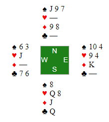Husk av vi kan av og til ha fått utlevert kort som ikke passer helt til signalsystemet vårt. Det du bør gjøre når makker legger et sånt mellomstort kort er å se på hva som mangler. Her mangler Q-10-7. Det betyr at om makker har tre hjerter kan han ha Q87. Han ville i så fall normalt ikke lagt åtteren, men styrkekast med sin laveste, syveren. Han kan også ha Q108, i så fall har han lagt styrke! En annen mulig sits er at syd har 1087, men da burde han lagt tieren som et tydelig svakhetskast, for nord kan sett fra syds synsvinkel godt ha AKJx for eksempel. Da har vi (om syd har 10xx og nord AKJx) tre hjerterstikk med hjerter gjennom spilleførers dame-x-x senere.