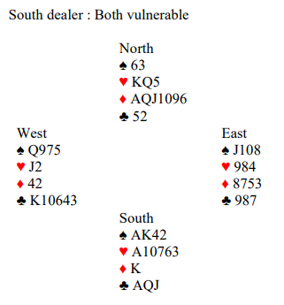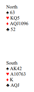 Vest spiller ut ruter. Det utspillet er litt kjedelig for spillefører, for nå er det problemer om hjerteren sitter 4-1. Med et annet utspill kunne du for eksempel løst 4-1 i trumf med knekten fjerde hos øst uten taper ved å spille konge-dame i trumf, så finesse med tieren idet det eventuelt oppdages at vest ikke har trumf i fargens andre runde. Deretter kan den fjerde trumfen tas ut, så stikkes ruter konge over med esset, og det er nok stikk.