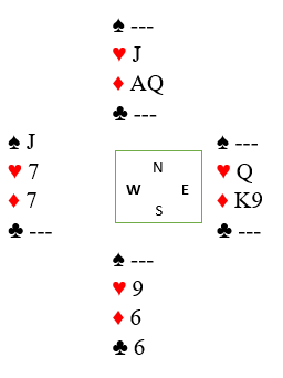 Syd spiller så ny ruter og kan dermed hente to stikk der. Har du plan for hvordan du la på dine rutere og ser du etter hva makker i Vest foretar seg? Hun sitter jo med minst ett stående stikk i spar og må ha 7-8 hp i alt men har jo alt vist sp DJ og ru A. Du ser resten, makker har ikke inntak , kan max ha kl J, og da må du sørge for at dere får så mange stikk som mulig.. Siste ruter tas Du må jo holde alle hjerterne dine for å bevare holdet men hvilken farge, hjerter eller kløver tror du at makker og du skal få stikk nok for å bete? Her kommer signalene inn. Du legger fra start lavt i ruter og viser styrke i kløver og da makker spilte opp sp 4 må det bety noe i kløver der også! Etter det siste stikket til i ruter saker du derfor kl 7. Hj D dekker du med kongen og Syd får for esset. Hj 7 løper så til 10-eren din og nå vet du at kløver ikke kan spilles fra kongen. Du spiller derfor hj 6 til bordet. Syd har nå et val på hvem av oss som har kl K. Spilles kl D dekker du og dere får et stikk uansett hva Syd gjør. Syd hadde fordeling 4-3-3-3 med AK i spar, hj A, ru D og kl A men ellers bare småkort. Han får bare 2+2+3+1 stikk. Bet altså. Men kunne ikke Syd bare stukket med hj J og spilt kløver til ess og ny kløver til din konge? Nei, her hadde Vest hj 9 og tas hj J avblokkerer du selvsagt hj 10 og det er makker som kommer inn. Og kan ta stikk i spar og kløver opp sikrer det 5. stikket vi får.