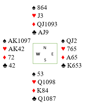 Når Øst er sterk og ikke bruker Stayman tyder det på moderat interesse for majorkontrakt. Mange ville nok valgt ruter ut som gir nærmest paradeløp for Vest, men Arne valgte i stedet å spille ut sp J! Bordet opp med 4- kort spar, bare hagel men likevel, var ikke som ventet, men da makker i Syd kunne legge 3-eren som styrke var mye gjort. Knekten beholt stikket, men hva så videre? Det tok ikke mer enn et par sekunder før sp K lå på PC- bordet og Vest fikk for esset. Kløver fikk løpe til Syd sitt ess og kløver til dame og esset i Syd. På ren opptelling kunne så sp D og sp 8 som sto tas. Senere kunne ikke Vest unngå må gi Marthinussen stikk for kl K som ga bet og faktiskm 86.5% score! Ruter ut kan slippes til knekten og spilles kløver opp må Wyd etter kl A spille spar og Nord må passe på ikke å blokkere. Bet henger da langt ute.