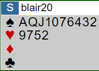 Blair forventet ville hender rundt bordet og klinket til med 6 spar I første hand i sonen mot motparten utenfor, en uvanlig melding må man kunne si! Ok, det kan godt være fem doblede bet rett ned hvis makker ikke har noe i det hele tatt å bidra med i majorfargene, og hvis han har verdier i minorfarge kan det ble fryktelig. På den annen side kan motparten godt ha en veldig høy kontrakt, hvem vet.