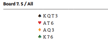 Ingen kan vite med sikkerhet hva som er riktig. Jeg tror imidlertid det oftere er riktig å passe med denne flate hånden. Det behøver selvsagt ikke være best i 3NT. Makker har imidlertid bare foreslått 3NT, og han kan godt ha en dårlig dobbelton i spar eller kløver, eller tre små i en av de fargene. Men er 4 hjerter noe særlig bedre da? Det er ikke sikkert nord har 5-3-3-2 fordeling en gang. Likevel, sjansen for at 3NT er minst like bra som 4 hjerter må være ganske stor, og det kan godt være at det er soleklart bedre i 3NT også, for eksempel om det er fire topptapere, men likevel ni stikk i grand.