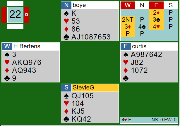 Curtis Cheek åpnet med Multi 2 ruter, og Huub Bertens spurte med 2 grand. Merk at Brogeland (nord) passet i første omgang med kort som mange antagelig ville tråkket til så høyt de kan med det samme, spesielt i gunstig sone. Passen førte faktisk til en misforståelse mellom øst og vest. Her hadde ikke Bertens-Cheek gode nok avtaler i den litt uvanlige situasjonen at det kom en innmelding andre gangen.