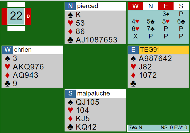 Nå stampet nord i 7 kløver, en god avgjørelse mot det han antok var +1430 til Ø/V. Det var litt farlig (i teorien), for Ø/V kan jo noen ganger melde 7 hjerter som står, og det gjør jo storeslem i hjerter her! Grude passet på 7 kløver. Det er kravpass, og for å gjøre det må han normalt ha førstekontroll (typisk renons) i motpartens farge. Hvis han ikke har noe ønske om å høre 7 hjerter fra makkeren vil han alltid doble i den situasjonen. Bakke syntes nok var nok og doblet 7 kløver. Det er jo riktig meldt selv om det denne gangen sitter så gunstig at det er tretten stikk i hjerterkontrakt. Storeslem er jo veldig dårlig her om man ikke ser den heldige sitsen. Å melde lilleslem er bra, men egentlig ganske hardt meldt det og.