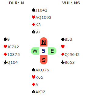 Arne (Ø) passet i gunstig, det samme gjorde Magnus men jeg kunne åpne med 2 hjerter som er en slags Tartan, tofarge hånd med 5 hj og 5+ i en av minorfargene. Wedeendro deretter opp 4 kløver- bud, alertertsom kløver pluss spar. Han fortalte med etterpå at konvensjonen heter «leaping Michals» og det satte fart på budserien. Marthinussen hadde klart til 4 hjerter, Magnus slo til med 4 NT og jeg som var i stampehumør meldte 5 ruter. Johan viste tenner med 6 kløver, Arne sto på videre med 6 hjerter og Magnus prøvde seg med 6 spar. Nå var Vest og Nord utmeldte, men Marthinussen bidro med 7 ruter som ble doblet. Siste bud var på en måte malplasert for 6 spar ser ut å kunne betes? Men siden Magnus i Syd med 7-eren fjerde i spar ville blitt spillefører kan ikke 6 spar betes. Men klarer Magnus med ruter ut til røff å dra hj K? Det vil hindre at 6 spar kan betes for hjerter stjeles hjem og sparfinesse med 2-2 imot går som smurt. 6 kløver av Syd står jo, men bare om Syd er spillefører. De aller fleste fikk spille 5 hjerter av Vest, mange doblet, men 650 inn er bedre enn 300 ut som jeg gikk i 7 ruter doblet med to bet. Beta Tore fikk 16,7% for det!