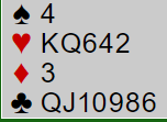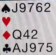 Jo her er det mulighet for skvis og da må sikre stikk hentes. Tre ganger hjerter gjorde underverker, for se nå på Vest sin hånd. Der var det hold i kløver, i spar og i ruter. Kl K kan sakes men da står jo kl Dx på hånden, Spar kan sakes, men ikke den siste for da står små spar på hånden. Sakes ruter står den fargen fra topp når Øst har ru K. Vest var altså skvist i 3 farger, progressiv skvis og 10 stikk som ga 86,1%. Noen få til klarte også biffen og en overmelding imot i major som kostet 800 ble topp, men nest topp smaker jo det også!