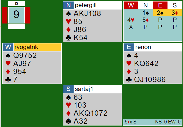 Med godt bridgevær, surt og fuktig ble det kraftig økning i deltakelse på tirsdagens sommerbridge. 38 par etter to svake kvelder i tropevarmen sist i juni. Her et vanskelig spill der salen var i 3 NT av Nord. Skjul Ø-V sine kort og følg spillet Lars Helgesen i Nord presterte. Han hadde åpnet i ugunstig sone med 1 kløver (3+), Øst gikk innpå med 2 hjerter, svake 2, og Tom Gjøs meldte 3 ruter med avslutning 3 NT av Helgesen.