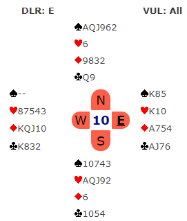 To Ø/V-par fikk tak i en doblet bet mot nords 4 spar etter minorfarge i utspill, bla. danske Dennis Bilde - Christina Lund Madsen. I deres kamp ville de imidlertid vunnet 8 IMP selv om øst hadde bommet utspillet og noteret seg for -790! Det var fordi lagkameratene som N/S ble doblet i 3 spar. Den står jo alltid (730), men da øst spilte ut hjerter konge ble det to doblede overstikk og +1130 til N/S. To overstikk? Joda, etter hjerter ut og mer hjerterspill trumfet selvsagt øst i tredje hjerterrunde. Men så forsøkte han sparskift (han så ikke nords hånd) i et desperat forsøk på å bete 3 spar doblet ved å få tatt vekk trumf fra syd slik at Ø/V kanskje kunne få flere ruterstikk. Men det skiftet kostet enda ett stikk, og med elleve stikk til N/S og +1130 ga spillet 16 IMP.