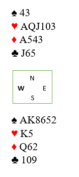 Det er vel enkelt, 6 hjerter av Nord så klart. Da er sp K beskyttet og uten spar ut blir det lett 13 stikk! Arne Marthinussen (N) var det etter litt pokeraktig meldesekvens av undertegnede. KL 9 ut løp til 10.eren, trumf til aeest og Vest var utsolgt. Hadde slevsagt ikke 4- kort i kløver og Øst med sp AJ10- hj DJ2. ru D87654- kl 8 fikk beten og 80% score. Surt, men slik skal også bridge være.