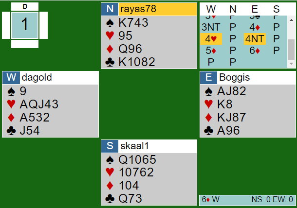 Det er en ok lilleslem i ruter, men nokså hardmeldt. Å stoppe i utgang er greit nok, men om de kommer inn i en sleminvitt-sekvens har begge spillerne fine verdier og det kan fort ende i slem. Merk at makkerparet mangler ingen Key-Cards, og bare trumfdamen mangler av de "viktige" nøkkelkortene.