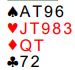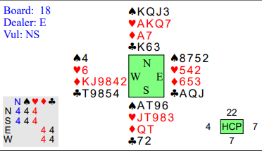 Lag STREET sin spillefører startet med trumfkongen og var raskt en bet i 6 hjerter da vest fikk to trumfstikk. Han ville vunnet kontrakten (selv med 4-2 sits i kløver) hvis øst hadde hatt fire trumf. Etter kongen og liten til knekten (øst har alså i så fall fire hjerter) som vinner ordner spillefører seg med en ruterstjeling hos syd og får tolv stikk. Sitter trumfen 3-2 går det ikke an å gå bet i 6 hjerter.