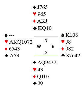Det ene N/S paret 7 hjerter! Spillefører startet med liten til damen og lyktes, tretten stikk og en massiv +1510! Ved det andre bordet meldte N/S 6 hjerter. Der spilte også spillefører liten til damen da hun ikke kjente igjen safevarianten. Så der ble det også tretten stikk, +1010.