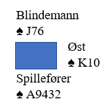 Vi tenker oss altså at under esset fulgte de med åtteren og syveren. Du spiller deg over til syd og spiller liten ruter mot nord. Så lenge øst ikke har K-J tredje fra start (uløselig kombinasjon for deg) må vest nå følge med enten knekten eller kongen og begge deler gjør at du har sikret deg at det blir kun en rutertaper.