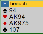 Et spill fra Hyggebridgen på BBO mandag denne uka der det var vansker å løse for å berge kontrakten. Ekstra problem er at man spiller mot ukjente motspillere og ikke vet hvordan deres stil er. Øst giver i gunstig sone. Terje åpnet selvsagt med pass, samme bud fra Syd men med 17 hp og jevn fordeling var 1 grand opplagt start fra meg. Nord passet, og Terje spurte etter majorfarge via Stayman 2 kløver. Da jeg hadde hjerter passet det fint og Solli oppvurderte sine 9 poeng inkl. fordeling til å rekke for utgang. 4 hjerter- men jeg ville jo lagt på hvis 3 hj var brukt. Hj D ut, skjul kortene imot og spill 4 hjerter som Vest.
