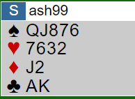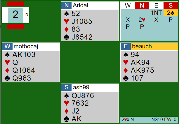 Her et spill som egentlig tvang seg fram, men se på hva Tom Gjøs i Syd skulle spille ut fra, og hva ville du gjort? Arne Marthinussen i Vest hadde åpnet med 1 ruter, pass fra Lars Helgesen i Nord og 1 NT (6-9/10 utren major 4- farge) og så gjenmelding 3 ruter fra Arne som undertegnede løftet til 3 grand med to ess, det burde rekke selv om majorbeholdningen var skral..