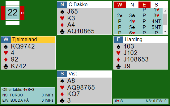 Det var kun 15 par (av 50) som var i 6 hjerter, og en endeløs rekke med utganger med tolv og tretten stikk ble notert. I kampen vant faktisk lag Turbo 11 IMP da N/S ved det andre bordet spilte 4 hjerter. Mot tre andre motstanderlag ville imidlertid +1010 for 6 hjerter med tretten gitt 11 IMP ut! Det var nemlig tre par som meldte storeslem og vant den.