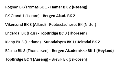 Engerdal BK møtte søndag et lag fra TopBridge BC fra Oslo 5. runde. Spillerne fra TopBridge var Fredrik Helness, Steffen Simonsen, Kåre Bogø og Espen Fasting. Alle disse spillerne er dyktige spillere som jevnlig frekventerer høyt på premielistene. Fredrik kom endog rett fra bridgefestivalen på Lillehammer med tre ferske NM-titler i beltet.