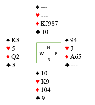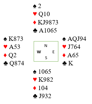 I dette spillet er det såkalt dobbel-tilpasning begge veier, dvs. de to sidene har hver sine to farger med god tilpasning. Da er det som regel veldig mange stikk i begge sidenes kontrakter. Her er det faktisk tretten stikk i sparkontrakt Ø/V. Det er imidlertid ikke så lett å melde slem, spesielt ikke med så friske meldinger fra N/S.
