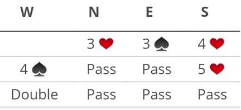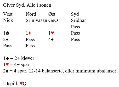 Siden syd hadde doblet opplysende kunne nord ganske trygt hoppe til 4 hjerter, han visste jo om en viss hjertertilpasning. Øst meldte 4 spar, og der stoppet de.