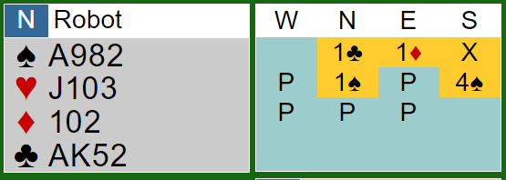 Da makker sa 1 spar var min hånd sånn midt i mellom litt forsiktig invitt til utgang og en litt tøff 4 spar-melding. Når en spiller med roboter får en forklaring på hva deres meldinger betyr, og det ble forklart at nords 1 spar var firekorts farge, ikke bare tre spar som kanskje noen vil tillate her da åpneren kan ha en veldig vanskelig gjenmleding. Ruter dame er ikke noe fint kort i denne konteksten, men resten er bra, og jeg valgte å gå rett i utgang som kanskje er litt hardt i parturnering.