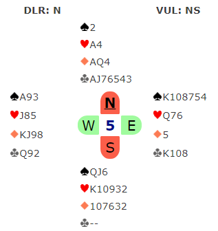 Øst får både for kløver konge og kløver dame i neste stikk, og nord vinner med kløver ess i tredje stikk. Vest hadde dobbel kløver fra start og kastet en spar i tredje kløverrunde.