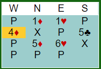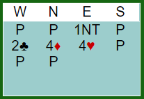 Med lag GILLIS N/S åpnet Simon Gillis (nord) med pass. Grude sa 1NT (15-17), pass fra syd, og vest valgte å bruke Stayman. Da spratt nord til 4 ruter. Det er uvanlig at grandåpneren melder på fire-trinnet neste gang, men her gir det mening. Hele grandåpningen er "virksom" med ingen ting bortkastet i ruter, og han har en fin femkorts farge. Grude meldte 4 hjerter og ingen hadde noe å tilføye. Det ble en taper i ruter og en i spar, +450 til Ø/V.