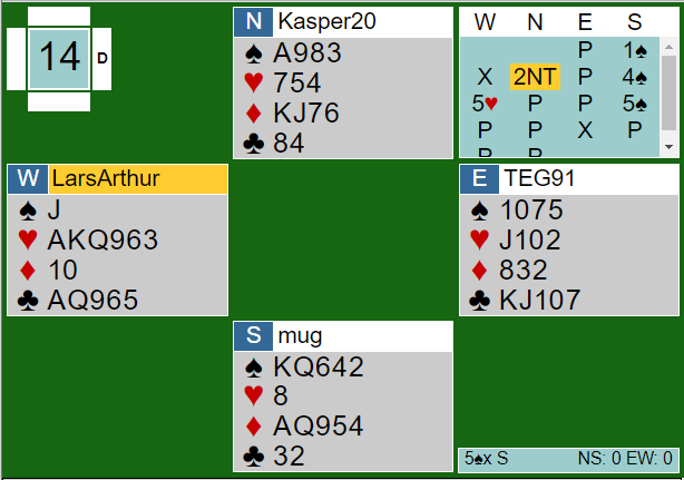 Det var altså en bet å hente i 5 spar doblet, men kontrakten føyk hjem i røyk og damp, +650 til N/S.