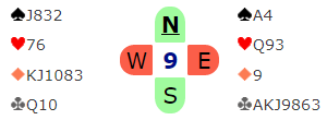 Nord åpnet med 2 hjerter som viste hjerter og en minor (under åpning). Allan (øst) meldte inn 3 kløver. Syd sa 3 hjerter, og etter pass-pass foreslo nordmannen 3 grand! Det er opplagt et forslag når det meldes i andre melderunde, øst kunne jo sagt 3 grand med det samme hvis han hadde hatt sterkere kort. Her hadde vest kløver dame som var et perfekt kort, og ruteren hans var heller ikke å forakte.