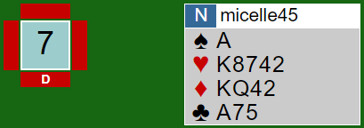 Amerikanernes meldinger startet slik, og så med søkemelding 3 kløver over "forsinket" 2 grand som viste 25-27 kunne syd finne ut om det var hjertertilpasning. Da nord ikke hadde majorfarge meldte syd 4 ruter – naturlig – og et par kontrollmeldinger senere var de i 6 ruter via Key-Card Blackwood. Det var enkelt tolv stikk der, og det ble tretten stikk siden sparfinessen gikk, +940.