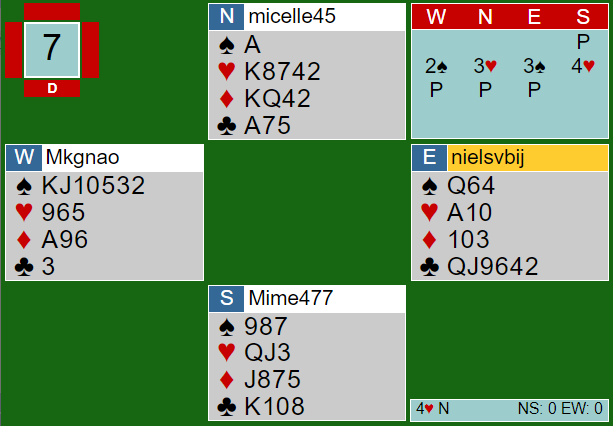 Syds 1 ruter var minst tre-korts ruter (beste minor stil), og hoppet til 4 hjerter typisk 18-19 uten kortfarge. Hva ville du spilt ut mot 4 hjerter?