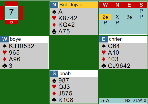 Det skjedde ved en rekke andre bord at vest fikk spille 3 spar etter samme meldingsforløp, dvs. nord valgte å doble opplysende heller enn å melde inn 3 hjerter. Spillet beviser kanskje ikke så mye om hva som er best i det lange løp i slike meldesituasjoner, så det blir bare antagelig bare litt sånn "Just saying"...