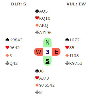 Helgemo er definitivt i den gruppen som mener det er best å melde inn med femkortsfarge i major fremfor å doble, og her gjorde han det også på tre-trinnet. Hans innmelding 3 hjerter gjorde det mye lettere for N/S da hele spillet så slik ut: