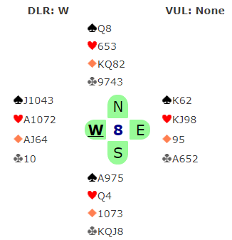 Det er klart at idet øst velger å åpne i tredje hånd med sin 11-poenger og de finner hjertertilpasningen vil vest oppjustere sine korts verdi. Men det blir av og til litt for mye Møllers tran på den måten, særlig når det dreier seg om kun en 4-4 tilpasning, og det er jo dessuten snakk om en utgang utenfor sonen. Nei, delkontrakt er ganske sikkert "vinneren" i det lange løp med slike kort.