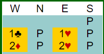 Etter 1 kløver – 1 hjerter (som viste spar) reverserte (sterkt) vest med 2 ruter (tilsvarende 1 kløver-1spar, 2 ruter for de som ikke bruker såkalte kløverføringer). 2 ruter viser normalt fire-korts farge og sterke kort, og planen var å få krevd slik at åpneren kan finne ut mer om svarhåndens kort. Da sa øst 2 hjerter, fjerde farge som uten en revers normalt er kunstig krav til utgang. I denne meldesituasjonen – etter en reversmelding – er det imidlertid et behov for andre regler…
