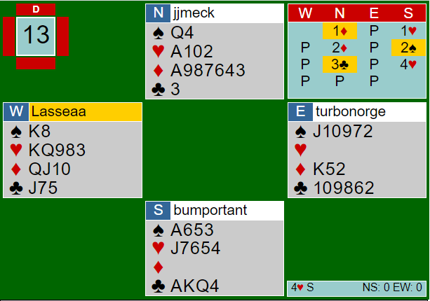 Ved vårt bord passet Hans Lindberg (Ø) og Tone Annette Olsen åpnet med Multi 2 ruter (svake 2 i major eller en jevn 20-21 hp grandhånd). Og Per Even Melby (V) doblet. Nå kunne jeg, i stedet for avslag-bud 2 hjerter som stopp mot svake 2 i den fargen hos makker, passe og indirekte vise lengde i ruter. Hans svarte da 2 hjerter, Tone Annette var utmeldt og passet men Per Even introduserte sin beste farge ved å melde 3 spar. Jeg kunne jo ikke gi meg der og meldte 4 kløver, Øst kom opp med 4 spar og så rundt til meg som våget 5 kløver. Det gikk så pass fra Øst og Syd men Melby ga seg ikke- 5 spar derfra! Hva så, er det hele over? Da makker i syd er markert med svake 2 i hjerter men velger kløver framfor ruter trodde jeg at 5 spar måtte vinnes for motparten. Derfor valgte jeg å stampe i 6 kløver, den kontrakten ble< selvsagt doblet med så var det spørsmål om aksjonen var lønnsom. Trumf ut hadde vårt pinibelt, men spar ut til esset og mer spar til stjeling var ikke katastrofalt. Jen kunne fortsette med ruter til knekten i Øst og skift til hjerter til knekt ess og stjeling. Ny ruter til K fra Øst og nå kom trumf opp til min 7-er. En tredje ruter kunne bare Øst sake majorkort på og kl 10 vant stikket. På kl K fulgte de trumf imot. Så hjerter hjem til stjeling, kl A som dro ut siste trumf og resten sto. Bare to bet, 300 ut mot 450 for 5 spar hvis det står. Vest har en taper i kløver men må så unngå to tapere i hjerter- men det er vel enkelt. Syd må jo ha 6- kort hjerter og da drar Vest bare hj D som tvinger Syd til å bruke kongen og da den stikkes er det bare en taper igjen. God stamp altså- mot 5 spar, men flere andre hadde fått tilslag i 5 kløver doblet og bare 100 ut. Dermed beskjeden pluss for oss.