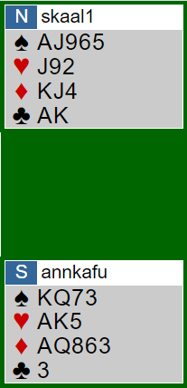 Det var ett par til 7 spar, to par stoppet i utgang, og resten var i 6 spar med tolv stikk.