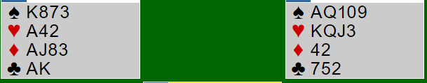 Syd svarte 2 grand - Stenberg - og nord sa 3 ruter som var seminaturlig med ekstra verdier. Syd sa 4 kløver (kortfarge), og nord kontrollmeldte ruter. Det måtte sett fra syds synsvinkel være ruter konge, og det er som oftest kongen fjerde eller femte siden 3 ruter var "naturlig". Idet syd spurte med Key Card Blackwood fikk hun vite om spar ess, så over 5 grand - storesleminvitt - viste nord kløver konge med meldingen 6 kløver. Da var det bare å telle opp for syd: fem sparstikk, to hjerterstikk, fem ruterstikk og to kløverstikk  = 14, atlså var kanskje ikke runden via 5NT strengt tatt nødvendig. Konklusjon: 7 NT!