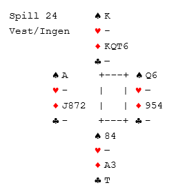 Mot Solums 6 kløver kom hjerter konge i utspill til esset. I stedet for simpelthen å ta ut trumfen og ta tre runder ruter fikk han laget en skvisposisjon som hadde fungert om vest satt med spar ess sammen med de fire ruterne. I andre stikk hjerter til stjeling, trumf til syd, og nok en hjerterstjeling. Så resten av trumfene. Om ruteren gir fire stikk gjør den jo det til slutt også, det haster ikke med å prøve det. Her er sluttposisjonen sånn som det ville sett ut om vest faktisk hadde spar ess: