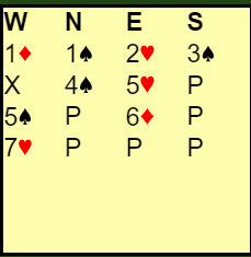 Vest sin 5 spar må være storeslemsinvitt, for det er jo ingen vei tilbake til utgang etter den meldingen. Når så øst kontrollmeldte ruter med kun en andrekontroll og uten kløverkontroll måtte han vel ha veldig god trumf, og vest meldte storeslemmen. Det er nok ikke hogd i stein hvor god østs trumf er i en sånn situasjon, men sannsynligvis må den være god nok til at det er en god sjanse i 7 hjerter. Godt vurdert!