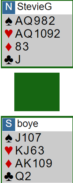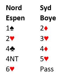 Ved det andre bordet gikk meldingen mer sofistikert, og det var vel en 7-8 meldinger som ble alertert. De fant ut veldig mye og havnet i den klart bedre storeslemmen 7 ruter. Der må imidlertid ruteren sitte 3-2, og da den satt skjevt var det ingen sjanse, +100 til SKEIDAR, og dobbeltscoren 2320 er verd 20 IMP!