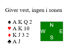 Ukens tema kan være satse eller ikke satse. Først kan du studere Nord sin hånd her, du er i gunstig sone og Øst som er giver starter med 1 ruter (4+ og 11- ca 20 hp). Makker i Syd går innpå med 1 spar og Vest drar uten særlig betenkning opp 3 NT. Hva tenker du om dette og hva gjør du selv?