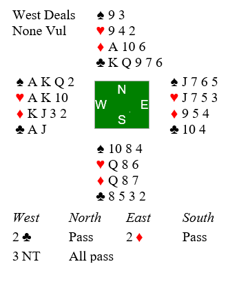 Mot oss hadde riktig nok Øst gått innpå med 2 ruter, men da jeg frivillig meldte 3 NT vet jo Tone Annette at jeg har 4- kort spar og rettet til 4 spar. Men da ruter kom ut med taper til A og K både der og i kløver var det fort en bet og -100. Det ga 16-26 tapt spill. Men ca 1/3 hadde som Syd passet 3 NT og rører motparten minorfarge er det der alltid minst 9 stikk. Vunnet 3 NT med 9 stikk ga 34-8 i score, en stor forskjell selv om 4 spar oftest er beste kontrakt. Var Syd inspirert eller var det «bare flaks» å passe ned 3 NT?