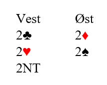 Tirsdag med RealBridge i Fredrikstad/Namsos kom en ny variant. Tone Annette Olsen (S) var da min makker og vi møtte Gorm Norstad (Ø)- Jan Talberg (V). Jan var giver i ugunstig sone og åpnet med 1 ruter, jeg hoppet innpå med 4 hjerter og så skulle Gorm melde. Hva ville du valgt med de 10 poengene, åpningen lovte 4+?