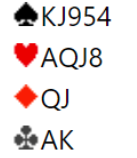 Knut Molander (N) åpnet med 1 ruter siden de brukte grand 10-12 hp utenfor faresone og Rene Eriksen (Syd) hadde ikke noe godt bud i farge og valgte derfor svar 2 kløver som egentlig viser 5+ farge men som her var nød- bud og minst rundekrav. Med 15 HP valgte da Knut å hoppe til 3 NT og nå gjorde Rene kort prosess ved løft til 6 grand. De fleste ellers åpnet nok i Nord med 1 NT (jevn 15-17 hp) og av 19 bord kom 10 i 6 NT. Normalt kom kl 10 ut og du ser sikkert at her må du løse de røde fargene uten taper. I ruter mangler du jo D10 femte og normalt må derfor den fargen spilles med ru A og mer mot bordet. Molander gjorde det, og etter kl D i 1. stikk kom ru A i 2. runde ruter kom ru D på fra Øst og dermed var 4 stikk i ruter vunnet. I tillegg to sikre stikk i spar og tre i kløver så nå trenger man 3 stikk i hjerter uten å få taper der. Knut tåkela situasjonen litt ved å spille spar til K og Øst vant med esset og fortsatte med kl 9. Den løp til kongen og så ruter J der Øst sakte spar. På ru 9 la Vest hj 4 og Øst en spar til. Hvordan vil du nå spille hjerterfargen? Molander så at motparten vanskelig kan skjule kortene helt, men antok at Vest neppe ville sake hjerter fra Dxxx. Dermed spilte han hjerter hjem til esset og deretter hj J, ny liten fra Øst og så liten fra bordet. Vest var da utsolgt og 12 stikk vunnet. Øst hadde sp A93- hj D987- ru D7- kl 10985. Iwona Larssen klarte også å vinne 6 NT mens de 8 siste parene i 6 NT gikk bet, et par til og med to beter. Egentlig er det Vest som må unngå å sake hjerter, Øst vil jo ikke gjøre det. Da har Nord ikke gode indikasjoner på hvor hj D er. Vest så jo at Nord bare hadde 4- kort ruter, dermed ikke 4- kort kløver normalt, og da kunne kløver sakes av både Ø og V på 4. runde ruter.