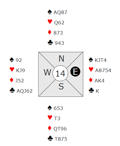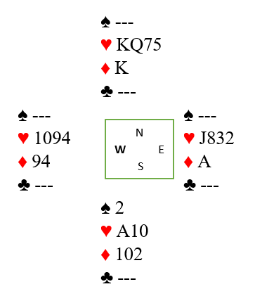 Her hadde ikke syd hjerter 10, men likevel blir øst nødt til å ta med seg ruter ess hjem, stikk for det kortet får han ikke om han skifter til hjerter eller trumf i fjerde stikk.