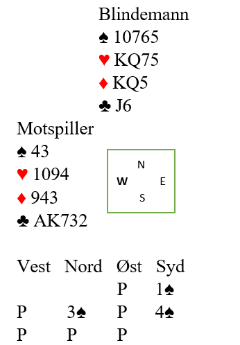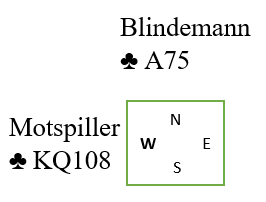 Du spiller ut kløver konge og spillefører legger liten fra bordet. Hvis øst sitt kort nå er fordeling er det umulig å vite om du kan fortsette. Hvis øst for eksempel antyder tre kort i kløver med et fordelingssignal kan jo det godt være han har tre små slik at spillefører har knekten. Fortsetter du slippes andre kløver til syds knekt. Hvis du ikke fortsetter med kløver og makker har knekten taper forsvaret et viktig tempo. Det samme blir det med tre små hos blindemann, du vet ikke hva du skal gjøre med mindre makker forteller deg det med et styrke/svakhet-singal.