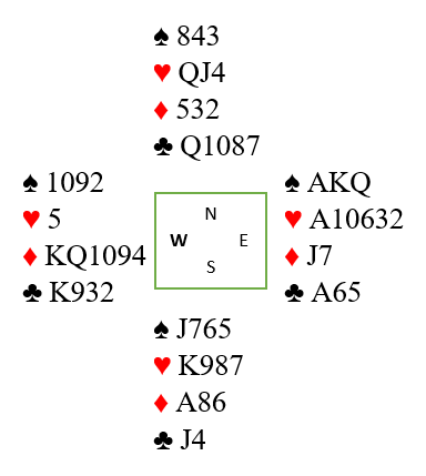 Her er det nokså opplagt at ruterfargen er vår ressurs. Det er enkelt å godspille fire ruterstikk. Det er bare å presse ut esset, ingen komplisert fargebehandling, eller andre forstyrrende faktorer. Det eneste man da behøver å tenke på om det finnes overgang senere til den hånden de godspilte stikkene er. Her er eneste inntak til vest kløver konge om de da ikke er snille og stikker med ruter ess i fargens første runde.