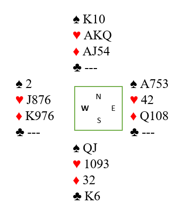 Med de gjenværende 10-9 i spar hos nord og Q-J hos syd kan ingen motspillere i verden hindre at syd får inntak til kløverstikkene og det blir 2+3+1+4= 10 stikk.