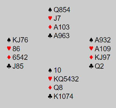 Her vet øst at de har minst åtte spar til sammen, men bruker likevel 2NT, i dette tilfellet for å finne ut mer fordi det kanskje kan være slem i kortene. Og han får drømmesvaret 4 hjerter som er Splinter, singel hjerter (og fire trumf). Dermed ved øst at kortene må passe veldig godt sammen og melder slemmen etter å ha spurt om Key Cards med 4NT.